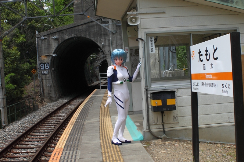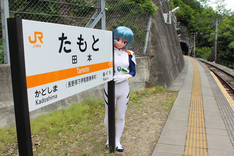 TAKAは旅行が好きです。 アニキャラなどの着ぐるみをやっている以上、基本オタクの類ではあるのですが、家に籠もるより外を出歩く方が好きな質で。仮に時間が無くとも、家で地図を広げては「ここに行ったら、どんな景色が眺められるのだろう?」と想像するだけでも楽しいものです。 今回、鉄道マニアの間では秘境駅として有名な信州飯田線の田本駅を訪ねて参りました。 私は鉄道マニアではないのですが、異色な駅であるということは随分昔から聞いていまして、いつかは行って、どんなところか実地に見てきたいと思っていたのでした。 なにが異色かというと、駅の周囲に人が住んでいない! 最寄りの人家ですら、20分歩いていかなきゃたどりつけないという、とんでもないところにある駅なのです。何だって、そんなとこに駅をわざわざ作ったんだろーか・・・? (^^;) と言うことで、ずっと興味津々でいたのでした。今回、たまたま平日に休みが続いて取れたこともあり、宿題にしていた秘境・田本駅を探検に行ってみようと思い立ちました。 そして、ただ単にブラブラ行くだけではなく、それはそこ、Dollerたる者ののたしなみで、着ぐるみを持っていくことも怠りません(w レイを連れて……何故、秘境駅に綾波レイなのか? まして何故山奥でプラグスーツ? ・・・それは神のみぞ知る世界(w だって・・・「さて、誰を連れて行こうか?」と考えて、すぐ脳裏に浮かんだのが綾波で。どうしても、それ以上に他は誰も浮かばなかったんです。何故か(^^;) 綾波の孤独と無人駅、無機質な駅という構造が綾波の住むマンションを連想したのでしょうか? ともかくも、自分でも訳分かりませんが、綾波と連れ立って行って参りました。 さて、その田本駅は長野の辰野から愛知の豊橋へ向かう信州飯田線の無人駅で、長野・愛知の県境近く、天竜川に山が押し迫り急峻な渓谷になったところ、天竜峡でも一番奥まった崖の中腹にあります。さて、近くまでは自動車で行ったものの、そこへたどり着く最後の30分ほどは、こんな崖沿いの山道を延々ドライブしなきゃ、近づけません。 ![]() そして下の地図を見てもお分かりいただけるように、なんと、駅前へ出る車道がありません! バイクでも自転車でも行けません。駅へ降り立つには、歩いていくしかありません! 大きな地図で見る 駅に最も近い民家の近くに自動車の待避場がありまして、とりあえずそこへ自動車を駐めます。ガードレールの切れたところに「田本駅」を示す小さな標識があります。ここが駅へ向かう歩道の出発点になります。ここから天竜峡の谷底目掛けて下っていった先に、目指す田本駅が待っています。 ![]() かくして、勇者・TAKAは綾波を封印した鞄を肩に担ぎながら、秘境・田本駅へ向かって出発しました。 両脇にジャングルのように雑草が生い茂っておりますが、さすがに「駅前通り」です。足下はコンクリートで固められています。 軟弱なアスファルト道路なんぞとは違う、立派な作りです。 ![]() 立派なはずの道です。 ・・・しかし、気持ち細くなってきているような、どんどん森が深くなって、先が見えなくなっていくような・・・ ![]() 本当に、駅前通りなのか? 不安になっていく展望。 コ、苔むしてはいますが、間違いなく駅前通りのはずです! だから、数年もすれば右の土手の上にはジャスコが、左の木々は伐採されてマルイが出来ているはずです。きっと・・・・ ![]() ヤ、ヤバイです、駅前通り! 道路の下の土が完全に崩落して無くなってます(汗) 右手の崖は岩盤剥き出し。落石がきそうです! ![]() くれぐれもサンダル・ハイヒールで行かないように。 心細くなりながら、駅前通りを更にトボトボ下っていく先、木々の合間に突如人工物がぽっかり姿をあらわしました。 あのコンクリートで固められた壁面に、へばりつくように、線路に挟まれている段があります。遂に、目指す田本駅へ到着です。 ![]() スタート地点の最寄りの人家から歩いて下って15分かかりました。 ホントなんで、こんなところに駅が必要なんですかいな!? 地元の人、この駅を利用しているのかなぁ??? 下りで歩いてきて15分ですよ。帰りの、帰りの登り道は20分かかりました(私は登りは強い方ですので、これくらい。30分くらいかかる人もいるようです)。 周囲は人家はおろか、人影も全くありません。 駅に降り立ちましたが、しーんと静まりかえっています。おそらくは周囲2km以内に、私以外誰も人はいないのですから。 久しぶりに、自分の心臓の音が聞こえるほどの静寂に浴しました。。。 ここが、伝え聞いてきた秘境駅ですか。見事に、なんにもない! (^^) ![]() さて、ただの旅行者なら、ここでホーム中程の待合室のベンチに座って、包みを開いてお弁当食べて、ほうじ茶を飲んで一服、となるところでしょう。 しかし私にはまだ、遠大な計画がある。そう、綾波に着替えてセルフロケを敢行すること。 それにこの駅にはトイレがないので、余計なものを胃袋に放り込んで、