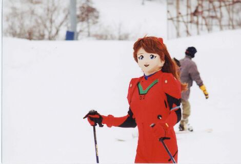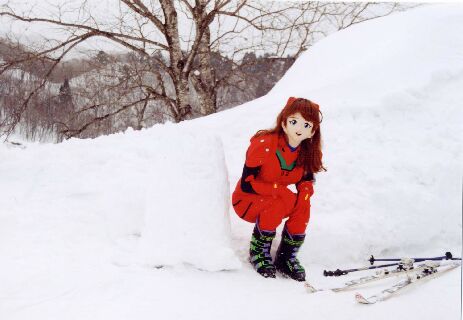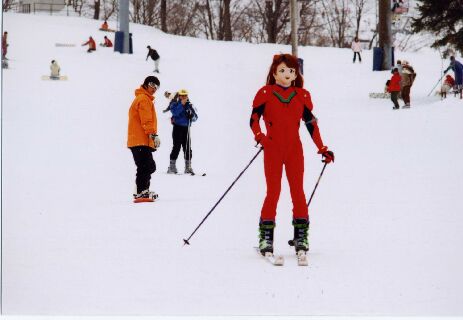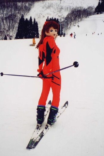 覚悟を決めて滑りだすと・・・・思っていたよりは、ちゃんと滑れましたね。着ぐるみで滑るときに困るのが、まず雪面がよく見えないこと。視界の狭さは気になりませんが、目の部分は紗になっているので、雪面の凸凹がほとんど見えないんです。ですから、パラレルターンはまずムリ。無理に滑ったら、たちまちエッジをとられてひっくり返るでしょう。シンジならともかく、アスカですっころんでいたんじゃ、イイ笑い者。それだけは避けないと。で、直滑降+シュテムターンで滑ることに。これならなんとか滑れました。