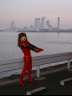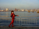 ロケは土曜の早朝。まずはお台場海浜公園周辺へ。日の出直前の港の風景を背景に撮りたくて、早朝に到着したのだけど、am6:20はさすがにチョット早くて幾分暗がり。時間つぶしに海浜公園入り口のオブジェの前で1枚。緑のライトが結構いい感じ。そのうち、段々明るくなってきたので、晴海方向をバックに記念撮影。やがて日の出を迎えて本格的な撮影開始。