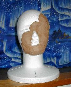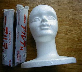 <学生時代、参考書を買っただけで勉強が出来たような感覚になるのと同じですね。 インダストリアルクレイ 工業モデル用の粘土。常温では固いが、高温(風呂の温度くらい)になると柔らかくなる。 通常の油粘土では表面をツルツルに仕上げるのが難しいこと、面ほどの大きさになると粘土自体の自重で変形してしまうため、私はこれを使用しました。 (アルテH ’00年頃は¥1300円:通常、面原型1つ作るのに、2.5〜3個程度使用。現在はもっと価格高いです) マネキントルソ 発泡スチロールの首から上の顔型。写真は目鼻口つきのものだが、ペプシマンのようなのっぺらぼうタイプもあります。どちらを選んでも造形上差は無いです。このサイズで面を作っては小さすぎてかぶれませんので、この後書くように盛り上げをしてしまいますので。 (マネキントルソ ¥950円) トルソはあくまで粘土造りの土台なので、コレを買わなくても自前で大きな発泡スチロールを削りだして頭の形に作り出すのも良いでしょう。また、発泡スチロールは粘土が付着しにくいので、スチロール以外の土台を用意し、その表面に人間の顔の輪郭の金網を方取る手法をする方もいます。 注)ここでの価格は全て購入時の値段です。 ’07.1注釈) インダストリアルクレイについては、こちらも参考にして下さい。 |