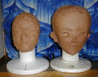 旧原型を取り崩して、インダストリアルクレイを再利用することも十分可能です。ただし、比較サンプルを見ながらの作業は楽なので(*)、初代シンジ面原型(右)は壊さず残しています。 (*) 面を作る上で難しいPointの一つが目の位置(あごの位置を起点にした目の高さ)。 単にキャラの顔付きに似せるだけじゃダメで、自分の目の位置と面の目の位置が一致していないと、面の目から視界を確保することが出来なくなります。 ところが、アニメキャラの目の位置と実際の人間の目の位置は、全く違う場合が多いのです。 キャラと同じ顔にすると視界が確保できなくなり、逆はキャラから顔付きが遠のいていきます。この辺にどう妥協を付けるかが大きな問題です。わざわざシンジ原型と比較しようとしたのは、この辺の妥協ポイントの見極めにしようという魂胆です。 キャラの顔付きをある程度犠牲にしても、どうしても視界の確保が出来ない場合は、 1)面全体を大きくしてあごから目の距離を相対的に離す。 (勿論この場合、面をかぶったときの等身バランスが崩れますので、ほどほどに) 2)眉毛の上側か下側にスリットを入れて視界を確保。 今回、小狼はこの2)を採用しています。 |