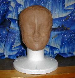 | ’00.06.02 自分の頭のサイズの大きさにするため、トルソ上に粘土の盛りつけ作業を続ける。特に縦方向の高さがかなり足りない。前作で使用したタミヤカラーのいらなくなったキャップ等をいくつも頭の上に載せ、その上から粘土を盛りつける。作業時間の短縮と原型の重量軽減を図る。シンジ面で残した粘土1/2は全て使い切り、5月に買い付けた粘土の1本目を開く。 本日の実作業時間1.0時間。 |