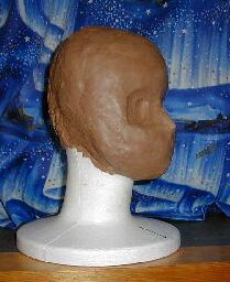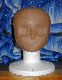 この段階では頭蓋骨をイメージしながら粘土を盛りつけていくとまとまりやすいようです。「表情」が必要な「顔」より無表情な頭蓋骨の方が簡単だからかな?。インターネット検索で「頭蓋骨」を検索するといくらでも画像が出てくるので、よく観察し、イメージを頭に描いておくこと。 アニメ顔といえど、人間の顔。そしてその基は頭蓋骨。だから、頭蓋骨が出来れば、あとはデフォルメしてアニメ顔に近ずけることが簡単になります(必ずしも頭蓋骨そのものをきっちり作る必要はないですよ〜。) |