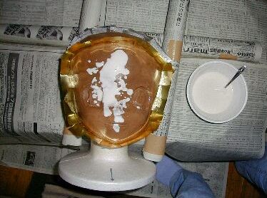 ’00.07.17![]() いよいよ石膏型取りを始めますが、まずは材料(解説右参照)。 ![]() いよいよ石膏による型取りを始める。石膏たらーーり。ぼたぼたぼた。 きゃ〜! あら、ついでに著者近影も兼ねてますね(画面右端の足) ![]() で、今日の所は顔正面と頭頂部の石膏付けまで行って作業終了。 実作業時間2.0h。 |