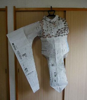 | ’00.09.15 型紙から再度新聞紙を生地に見立てて切り出し、再組立。これを昨日作った簡易トルソにかけて形状を見ます。 ![]() まだ形状に問題有りそうですね。 襟の部分はもっと幅を大きくしてもよかった。横幅は最初に作った型紙がきつかったため、今度はゆったり目に作ったけど、ゆったりしすぎか・・・・。 でも、これでおおよそ式服の型紙は出来ましたので、これからオレンジ色のストライプを作るためのサイドテープの長さを見積もります。 |