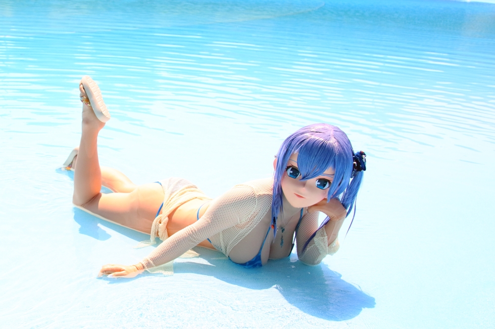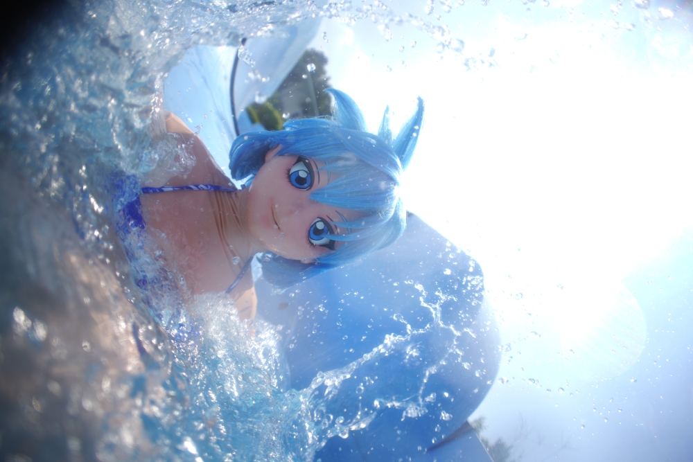 ヲータースライダーの最後、プールへの飛び込みシーンを撮りたいとの笹原さんのリクエストで何度か滑り飛び込みした内の一枚。いい塩梅に水飛沫が跳ね上がってくれるのが難しくて、何度もやってましたw