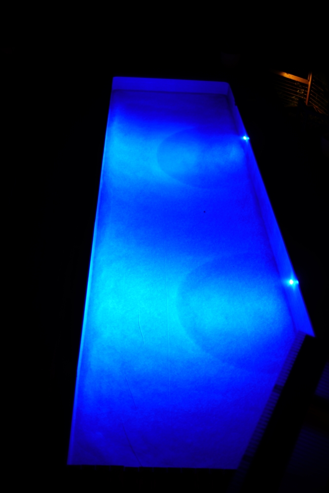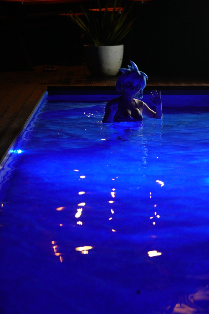 水中照明、青が冴えていいですよねぇ。.右下、長方形のプールの角が影になってるとこが東屋の屋根ですね(^^)