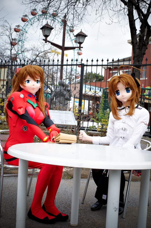 当初はskipするつもりだった12月のあらかわ遊園。 けれど前日のチャットで話していたら、ぱっどさんに酒井もぽとさんにみさとみなとさんらが行くとのこと。それじゃあと、先月のプチオフ同窓会(?)的なノリで急遽行ってみることに。 でも当日は予想以上に寒くて、アスカでいたのは1時間ほど。このプラグスーツは寒さに弱いのです。薄い生地一枚をカラダニピッタリ付けてる状態だから、断熱の役割をする「空気層」が衣装の間に全然出来なくて(汗) さっさと上がって、もっぱらだべっていたりしました。 撮影写真はいずれもぱっどさんです。 ![]() あらかわ遊園のシンボル、都電あらかわ線車両前です。 着替えて早々にぱっどさんに見つかってしまい(全身真っ赤じゃ、誰にもすぐ見つかるって!)、やはりここで撮らなきゃと、引き回されてきてしまいました。「鉄」属性はないんですけど、ここでまず撮るのがお約束というものでしょうか(w ![]() 当日はアスカ以外に4,5体着ぐるみさんがいました。曇りで寒かったせいもあるでしょうが、少なめでしたね。 車両は入場口からぐるりと回り込んでちょっと奥まったところにあり、アスカ以外にもぱっどさんに拉致された着ぐるみさんが同じ奥まったエリアにうろうろ(w 車両前でアスカ同様写真撮って貰ってる着ぐるみさん達を眺めながら椅子に座ってくつろいでます。 あったかいカフェラテでも飲んでいたいとこですけどネ(^^) ![]() 酒井もぽとさんのあけりんと一緒。紅白ペアというとこですか(^^) あけりんもシャツ一枚で寒そうな格好だったけど、アスカよりずっと長いこと着ぐるんでいましたね。もぽとさんは一年ぶりくらいにコスイベントに来たと言ってましたけど、ぱっどさんに同行していただいて、写真たくさん撮って貰えているようで良かったです。 ![]() ぱっどさんがカメラを持って右へ左へウロウロウロウロ・・・・。 何事か? と不思議に思っていたところ、なんとか白鳥を同じフレームに納めたくて右往左往してたみたいで。 動物相手の撮影は大変です(爆) ![]() 噴水シャワー前で。 ここは張れてるときに撮ったら光が散乱して綺麗でしょうね。これまであまり意識していなかった場所ですけど、いずれまたここでお願いしたいです。 と、言うことで今回は画像少なめ。最初に書いた通り一時間ほどで上がったのと、もぽとさんのあけりんを撮っていただくことに譲ってましたのでね。どちらかというと着ぐるむために行ったというより皆さんに会いに行ったのがもっぱらでした。更にはこの後東急ハンズに廻って次回作のための資材調達をして廻り。 さて、3ヶ月後の冬のワンフェスに新作が間に合うか? |