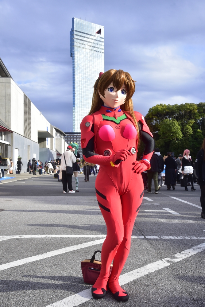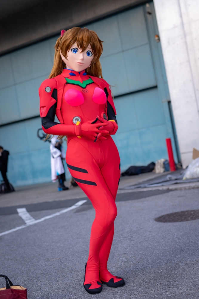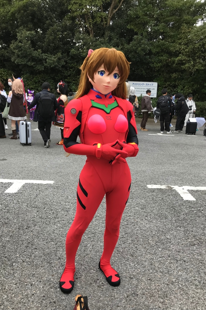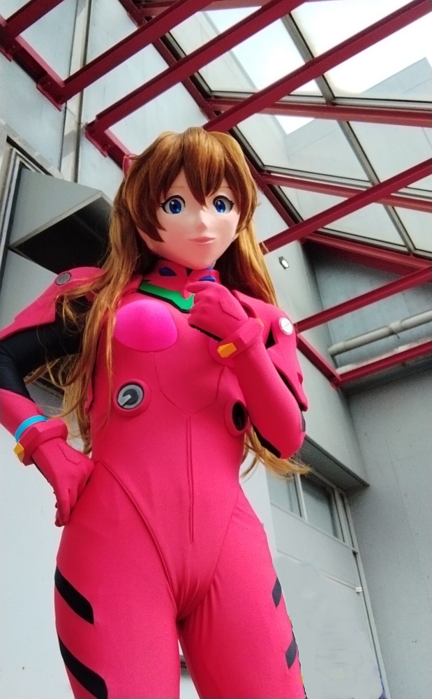 ![]() 6年ぶりです。2018年夏のワンフェスでキュアピーチを出して以来のワンフェス着ぐるみ参加! つまり、その間製作をやっていなかったと言うことです。 あっしは古い人間でござんす。いみじくも造形のイベントに自分で作る、少なくとも既成物に手を加えた物をお見せしてこその場と考えてるので、逆説的に言えば作らなきゃ着ぐるみで行けないのです(w (一度だけ、葛城ミサトを見たいというリクエストで、直近イベントでワンフェスがあったので出した、というのはありましたが) 私生活の方で色々立て込みまして、2017年頃から着ぐるみ活動を徐々にペースダウンしていて、2023年頃は(コロナの流行も相まって)ボトム状態でいましたが。若干状況が変化してきたので、去年の秋頃から着ぐるみ活動のペースを上げてきています。 その一環で、既存の面の作り直しを図ろうと。そのひとつがアスカでした。 私のアスカ面は2009年に作った物で、15年来使ってきただけに界隈でもよく認知していただいて、メイアと共に一種私のステイタスシンボルではあるのですが。その15年の間に次々あちこちの工房でアスカ面が作られて、どれも良〜い面を作っておられるのですよね。 面は既存の物を参考に積み上げられて時代と共に良くなっていきますから、15年前に作ったアスカ面も悪くはないけど、こうすれば良かったというところが色々私の心中にもありまして。そこで新しく、このワンフェスに合わせようと‘23年の11月頃から作成を始めて、 作りました。 ついでに、プラグスーツも新調しようと、あとロンギヌスの槍も作ろうとしたのですけど・・・プラグスーツは工房と日程が折り合わず、また面の製作が難航したこともあってロンギヌスの槍も間に合わず、5代目アスカは顔だけの新調となりました。 Re星さん撮影 ![]() さて、この面ですが、アスカはアニメ(漫画)の顔に近づけて作っていません。似てないなと思う方いると思いますが、意図的にそう作っています。 (もっとも、もう少し似た顔になる見込みでしたが、そこは私の腕前というか、良く言って6年ぶりの面製作で腕がなまったというトコか) よろずアニメキャラでもゲームキャラでも、それを着ぐるみでやろうとすると、二次元から三次元へ変換する作業になるため、完全に一致させることは出来ません。 ひとつには、漫画やアニメで描いている顔が、常に二次元方向からの見栄えを良くするため三次元には出来ないデフォルトされた顔で作っているためです。 もうひとつ。やはり見栄えを良くする、いわゆる「アニメ顔」に描いているため、顔の中の目の位置が人間の目の位置とはずれが生じます。面をかぶったときに人間の視界を確保するため、目の位置をキャラ本来の位置からずらす必要が生じます。 細かなところ(例えば雌型からの抜きやすさ等)を上げれば幾つもそうした原因はありますが、ともかくも完全に一致させることは不可能です。 実際に面を作るには、 1)落とし所を探り、アニメやゲームキャラ(二次元)の三次元近似解的な面を作る。 2)人間の顔(三次元)にアニメやゲームキャラ(二次元)のイメージをそれらしく投影した面を作る。 このふたつが実際な所と思います。2)はいわゆる「リアル面」、もしくはドール面的なもので、(あくまで印象ですが)全体の5%くらいか、残る95%のアニメやゲームキャラの着ぐるみ面は1)の方式かと思います。 先代(4代目)のアスカ面は上記1)の近似解的な面であったのですが、さて、2024年のWFに向けてどうした面を作るか、単に15年前に作った4代目からの諸々上乗せでも良かったのですが、1)でも2)でもない面を作って見ようと考え作ったのが、 画像の5代目アスカ面です。具体的には、 3)元々、三次元に「原初アスカ」がいて、それを貞本さんがアニメや漫画用に二次元へデフォルメして作った「アニメアスカ」がいると考える。 「アニメアスカ」から三次元の着ぐるみ面へ起こす方式を1)とするなら、今回私は「原初アスカ」がいるものと(想像)して、それを着ぐるみ面に起こす、という考え方で造りました。 これは2)とも違います。2)は誰とも言えない人間の顔にアスカのパーツをそれらしく投影したものですから。 「原初アスカ」は現実の人間(という生物)とは別種の生物です。何故なら、現実の人間はあんな巨大な目も、鼻の穴が無い者などいません。人間に近い、けれど別種の生命が存在しているものとして、それをアニメの絵から想像して作り出すのが3)なのです。 このやり方なら、同じ三次元であるから「近似解的な面」ではなく、本物と全く同じ面を作ることも可能です。理論上は。 ただし、誰も「原初アスカ」という生命を見たことが無いので、想像で作るしかなく、作ったところでそれが「正解」かは誰にも分からないのです。極論で言えば「へのへのもへじ顔」でも不正解と断じきれないのですが。 ですが。 ですが・・・自ずと、「原初アスカ」はそうじゃない、こうじゃないかという方向・感覚は多く