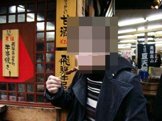 コーヒーカップを諦め、店先で名物牛串焼きに食らいつくTAKA。