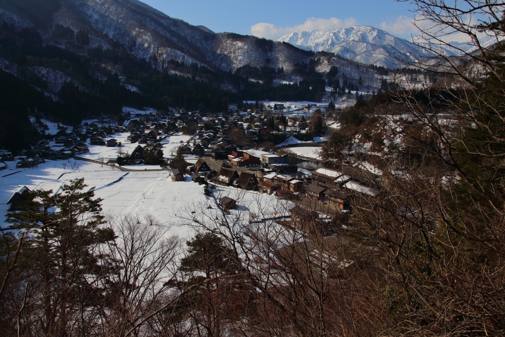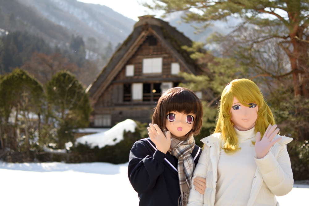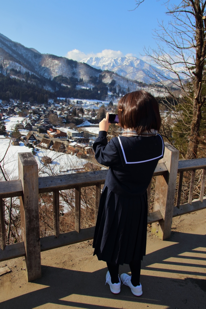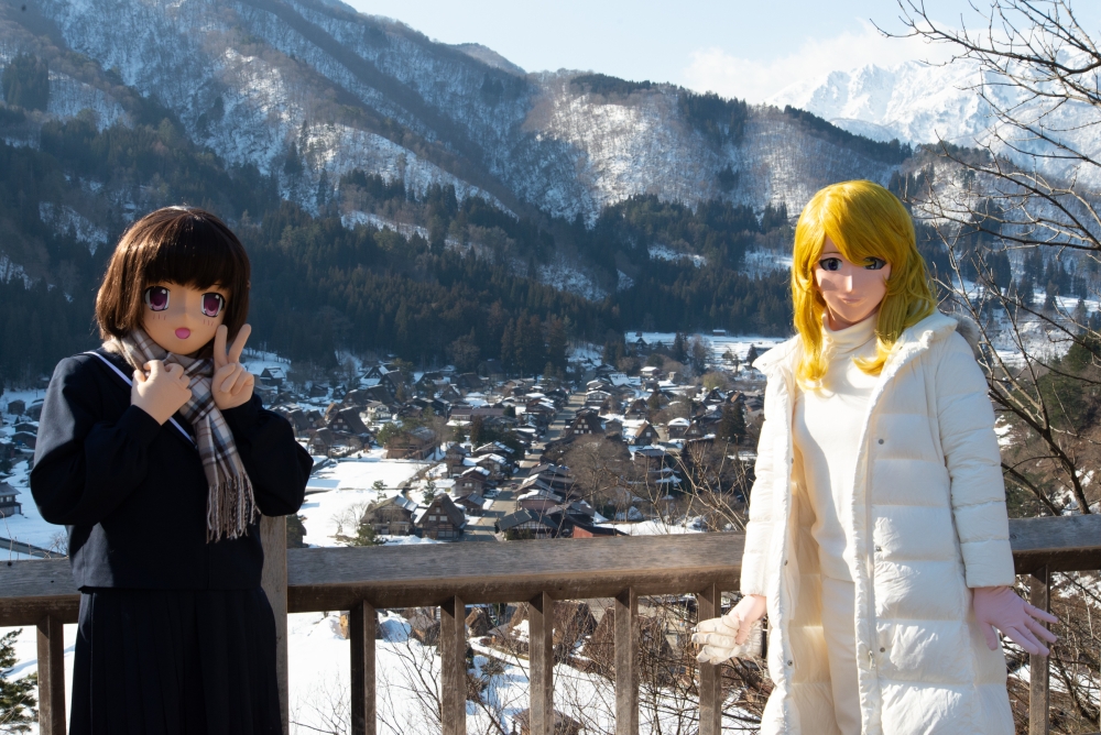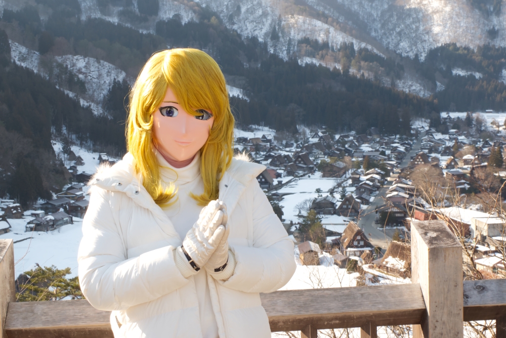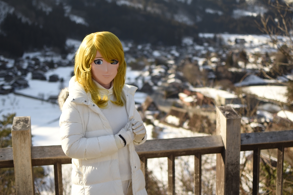 まず最初に白川郷全体が見下ろせる展望台へ。森雪に白ずくめのアウトフィットをさせての登場です。