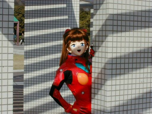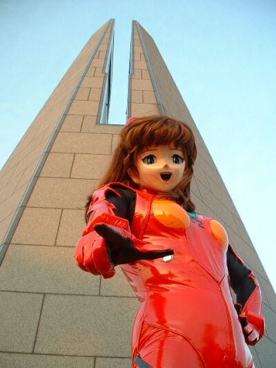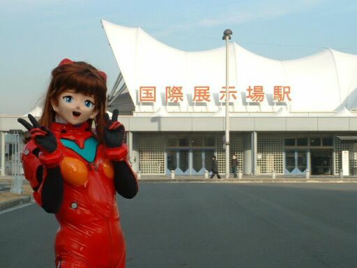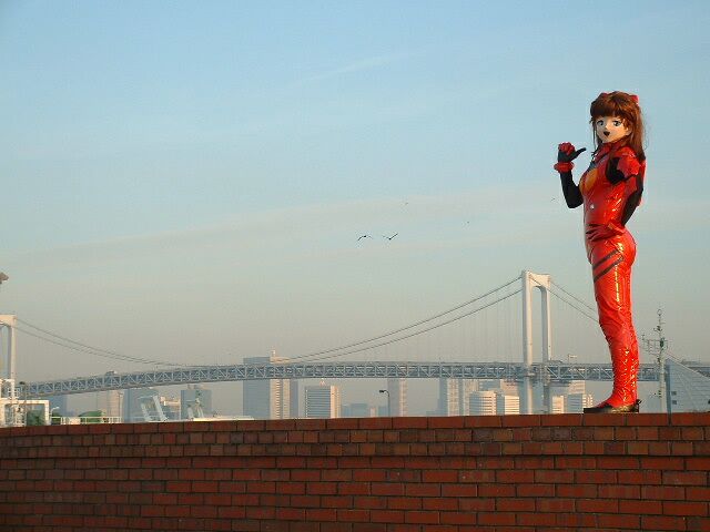 ビックサイト前でパチリパチリと。コミケに行かれる方は見覚えのあるところでしょう。コミケやWFの時とは朝から人がわんさかといるんですけど、この日はうって変わって閑散としてました。もう朝の8時半まわってたんですけどね。右から2番目の鏡に映ったアスカ、これどっちが本体かちょっと分からないでしょ。