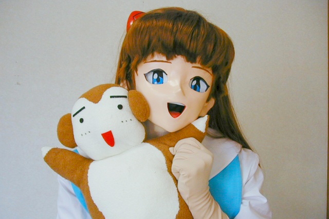 (制作記録) アスカについては7回面を作っています。そのうち、ネット上で公開したのは3作のみです。 ともかく、上述のようにアスカが好きで着ぐるみの世界に飛び込んだのですが、その当時(’98年)に着ぐるみを作ってくれるところはどこにもなかったのです。着ぐるみをしたければ自分で作るしかない時代だったのですが、私は「不器用世界一」と周囲から言われるくらい手先が不器用で、美術・工作といった授業も学校の成績は悲惨なモノでした。 だから、非公開のNG面もいっぱいあるのです。。。。 左上写真の最新作の面は制作順で行くと六代目に当たります(七代目は失敗で廃棄)。’01.8に完成。 それと左上写真のストレッチエナメル製のプラグスーツは自作です。 もう、血の汗流せ、涙を拭くな、の思いで作った労作です。 プラグスーツはコスプレショップに頼めば作ってもらえますが、一度は自分で作ってみたいと頑張った作品です。 ただ、これを作ったとき、普通の生地と同じに、当初ミシンで縫って作りましたけど、糸を通す穴を起点にエナメルが裂けやすいですね。プロの方ならその辺上手い対処の仕方も知っているのでしょうけど。素人が作るなら縫うより、接着剤でつなぎ合わせるのをベースに、一部を縫って作る、とした方がよいかもです。 あと、抱いてるみやむー猿も自作です。 このみやむー猿、背中にはチャックがあって小物入れ替わりになると言う優れものです(w アスカ単体だと子供は寄って来にくいので、このみやむー猿があると子供の好感度もぐぐっと上がります。 |