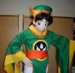 | ’00.10.22 胴体部の太極マーク等の模様をフェルトで作成。黒と白と黄色の半径の異なる円を幾つも切り出し、フェルトが湯水のように使われていく。ふえぇぇん・・・。 また、当初から最大の難関と考えていた襟を立てる作業を行う。 帽子で使用した心材を襟の形状に作成し、これをはめ込む。あ、思ってたより簡単に行けた。 実作業時間6h |