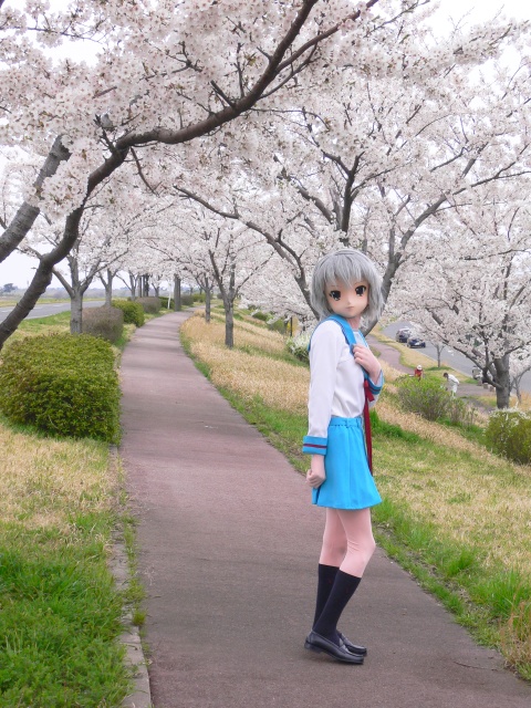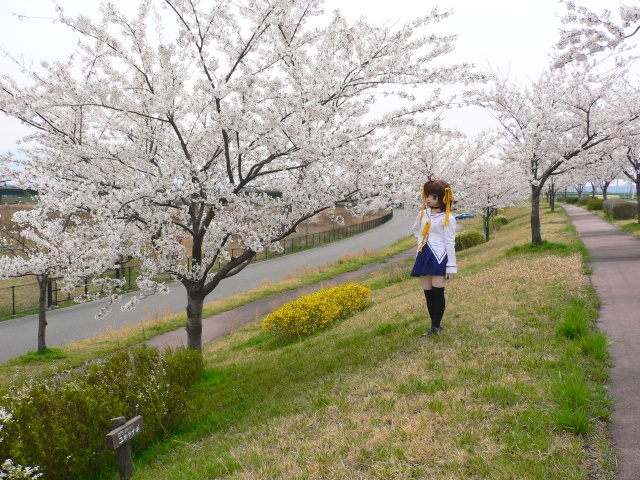 場所は河川敷の遊歩道沿いにある細長い公園緑地で撮影していました。これだけ桜が咲いていて、あまり人がいない良い撮影スポットです。桜も並木のように揃っているところや、一本だけ離れているものも有りで結構変化に富んでいます。足元も舗装されててしっかりしていて、階段の段差もゆるやかなので着ぐるみ撮影にはもってこいの場所でした。