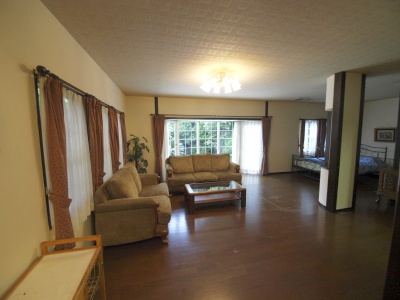 左上がキッチン&ダイニングからリビングルームを撮影したもの。右上が二階へ向かう吹き抜け階段。