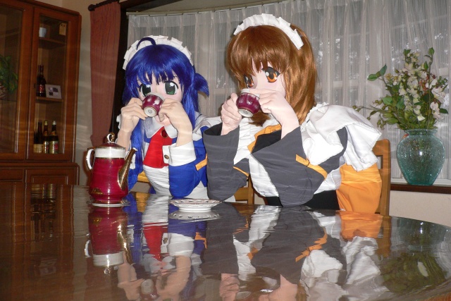 あと、テーブルに姿が映る反射が面白いので、着ぐるみさん二人を画面中央より上目に配してみました。
