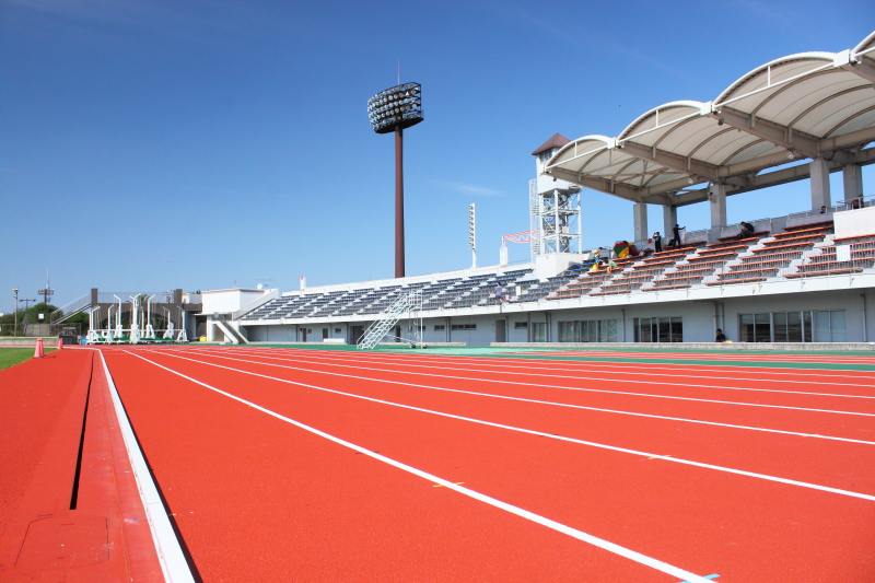 正面観覧席からトラックを見下ろします。それにしても、日差しの強い日でした。