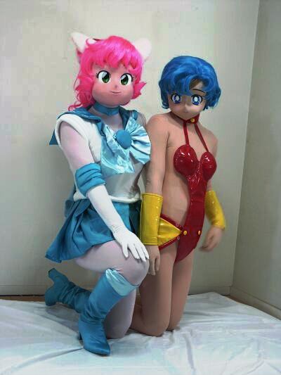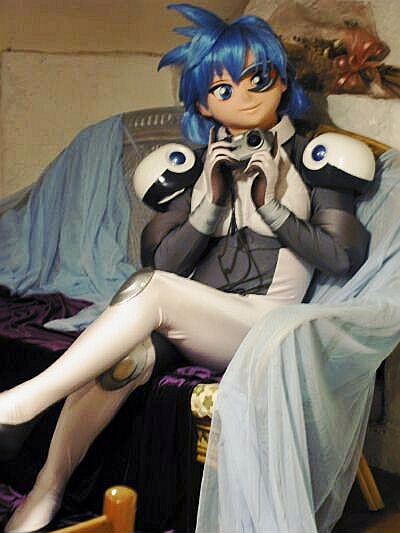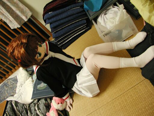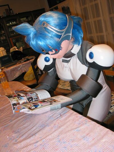 さて、誰か撮ろうかな〜とカメラ持ってるメイア。そのうちテーブルに置いてあったアイドロイド誌をちらちら。去年の11月の大オフ記事を読んでます。ミナトさんも部屋に置いてある単行本を読みふけってます。うーん、マターリとした着ぐるみなひととき。