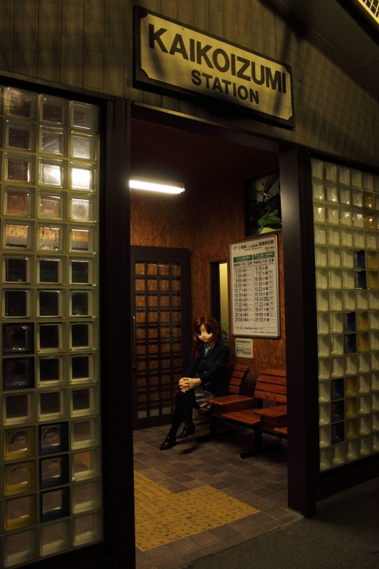 すっかり陽の落ちた駅待合室で、ついでに撮影。