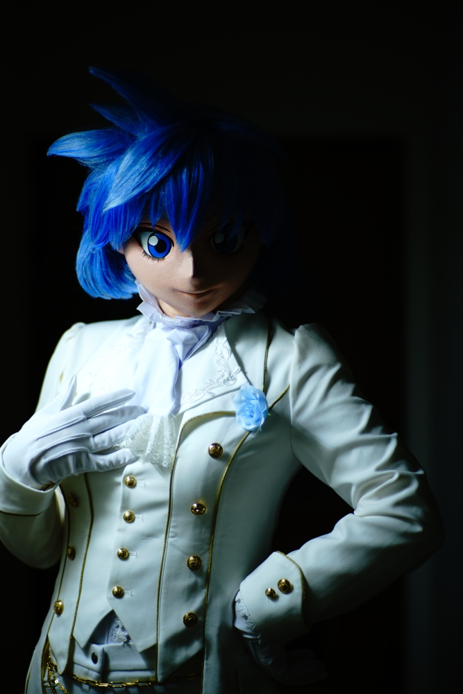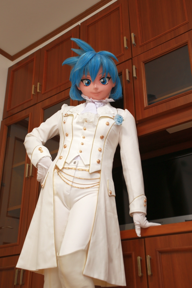 王子様衣装です(笑) ネットで上着を見かけて一目惚れ。即購入して、これに合うズボン(乗馬パンツ!)に内に着るフリル・ワンピースを探し廻りと、もう購入へフル回転。白で統一(青バラをワンアクセントに)した衣装を準備しました。