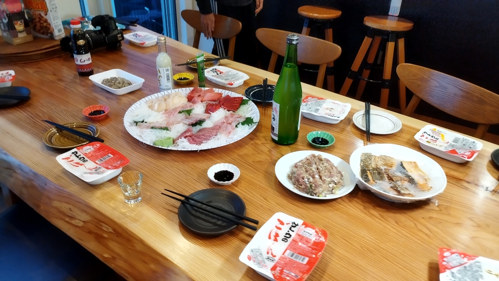 中途半端に明るい17〜19時は見切って、夕食タイムに。有志準備による夕食は、刺身盛り合わせコースとなりまして。皆でうまうまいただきました。