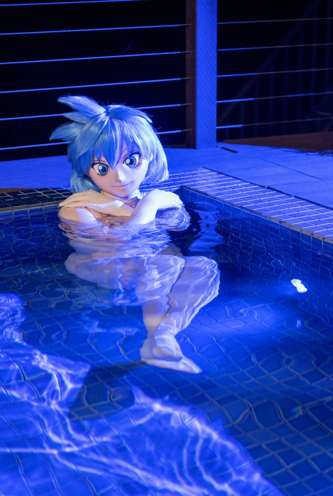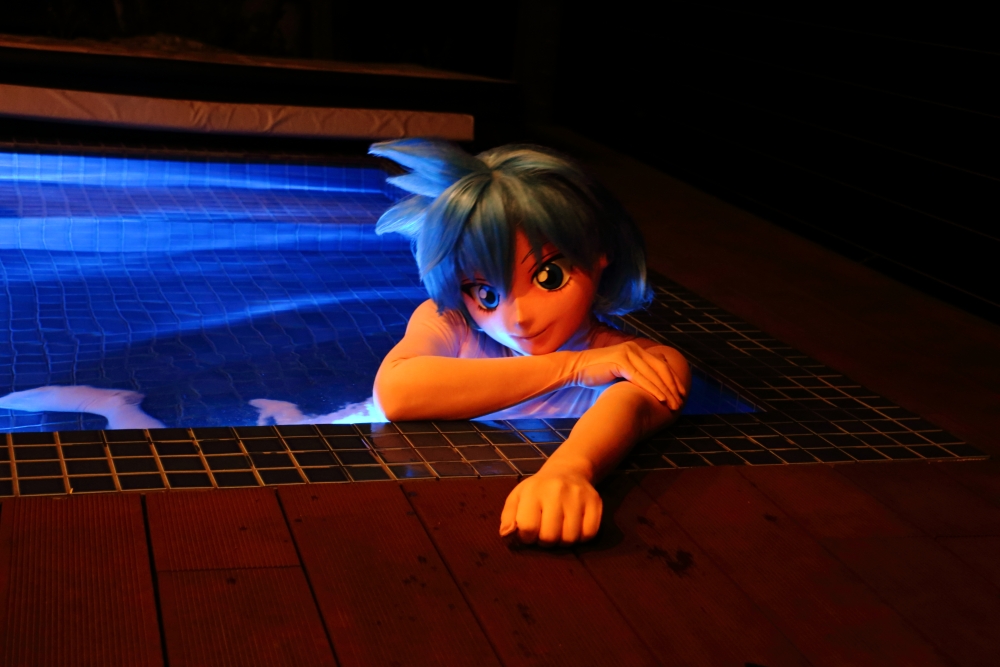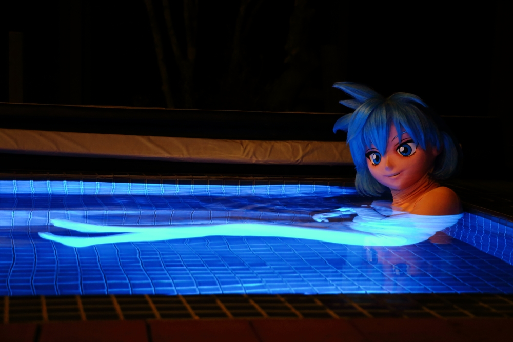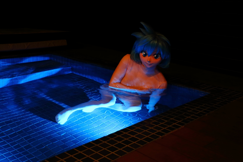 これまで着ぐるみで温泉に入るチャンスは過去にあったのですが、温泉は少なからず硫黄成分があるので、肌タイの生地を傷めるだろうなと入りませんでした。今回、初めて入浴したわけですが・・・濡れた肌タイが波に揺られてタパタパ肌に触れてくるのが心地良いんです。タパタパだけじゃ言い足りないですね。濡れているので、ヌメヌメとまとわる感じも合わさって、この上湯は適温だしと、極楽極楽(^^)